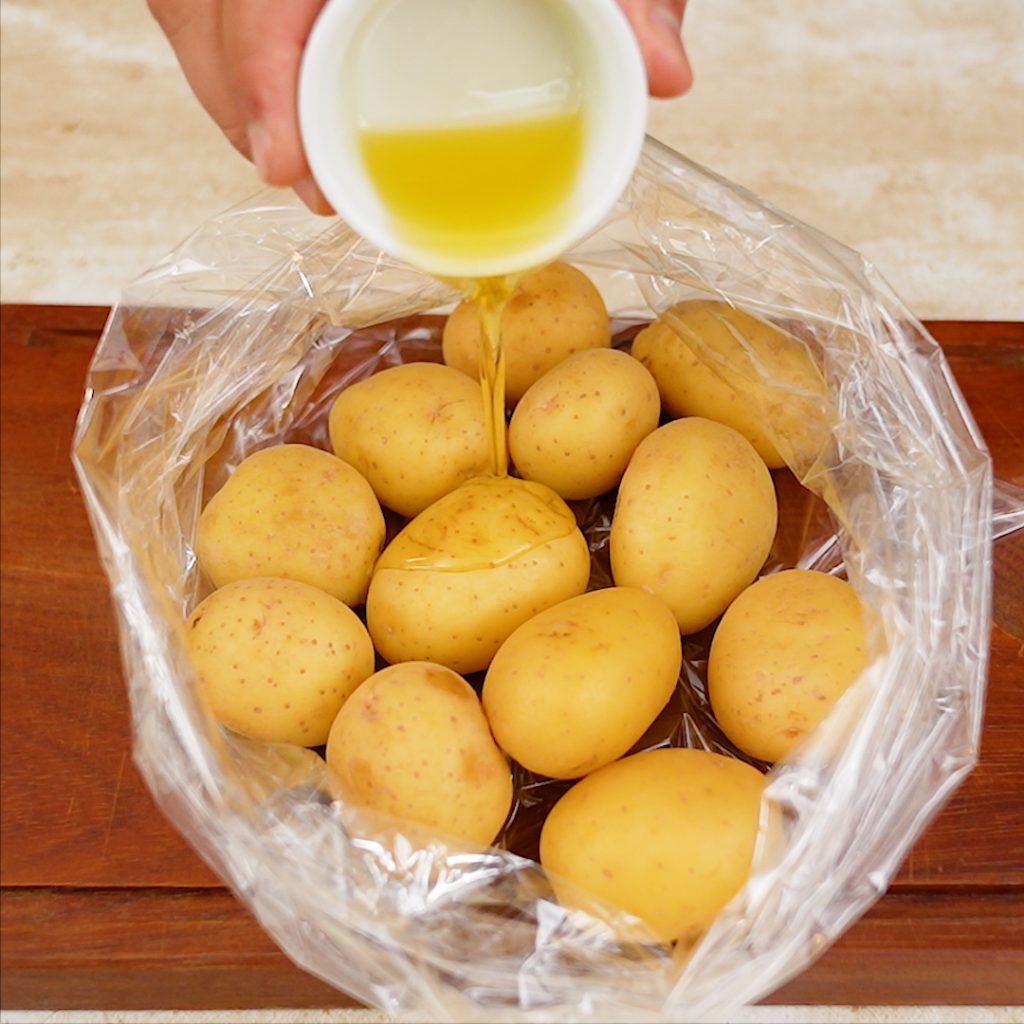 700 kg – ziemniaki 4 łyżki oliwy z oliwek Sól, pieprz czarny, papryka i papryka czerwona w płatkach – do smaku 100ml – woda 4 ząbki – czosnek Oliwa z
