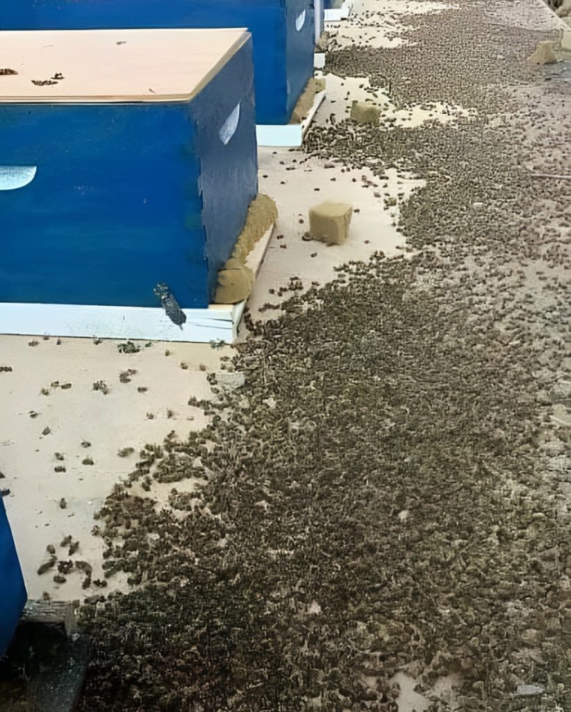 Niestety, mamy tu tysiące martwych pszczół, dotkniętych stosowaniem pestycydów w naszym kraju. Niestety, nasz cykl życia gdzieś się tutaj kończy.