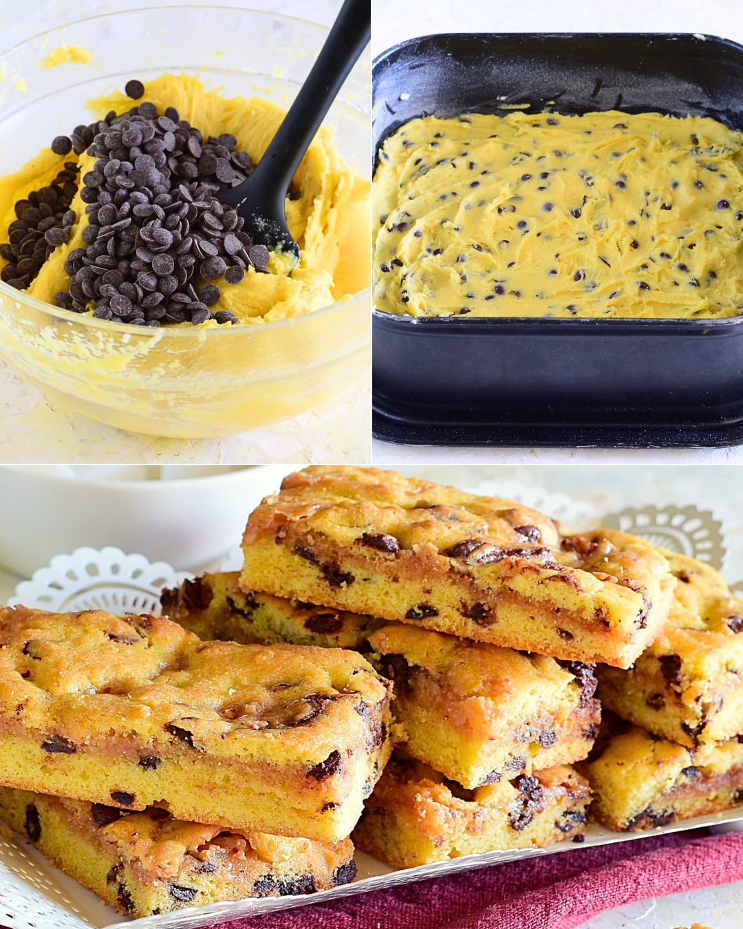 Aby je przygotować, wystarczy ubić miękkie masło z cukrem i łyżeczką ekstraktu waniliowego za pomocą trzepaczki elektrycznej, następnie dodać po jednym jajku, przesianą mąkę z proszkiem do pieczenia i kawałkami gorzkiej czekolady, a następnie wlać 2 /3 gęstej i kremowej masy przelać do kwadratowej formy o boku 20 cm. Na tym etapie wystarczy zapiekać wszystko w piekarniku statycznym w temperaturze 180°C przez 15-20 minut, następnie równomiernie wylać na powierzchnię sos karmelowy i na koniec rozprowadzić resztę ciasta. W efekcie po kolejnym przejściu przez piekarnik powstanie krótkie, przyjemnie wilgotne w środku ciasto, które pokroimy na wiele regularnych prostokątów i podamy później jako przekąskę lub na zakończenie posiłku wraz z filiżanką mokki kawa.