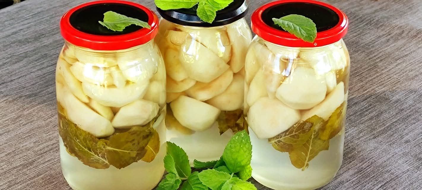 Do czystych słoi 09 l włożyłam po 25 liści mięty. Na miętę wsypałam cząstki obranych i wydrążonych jabłek.