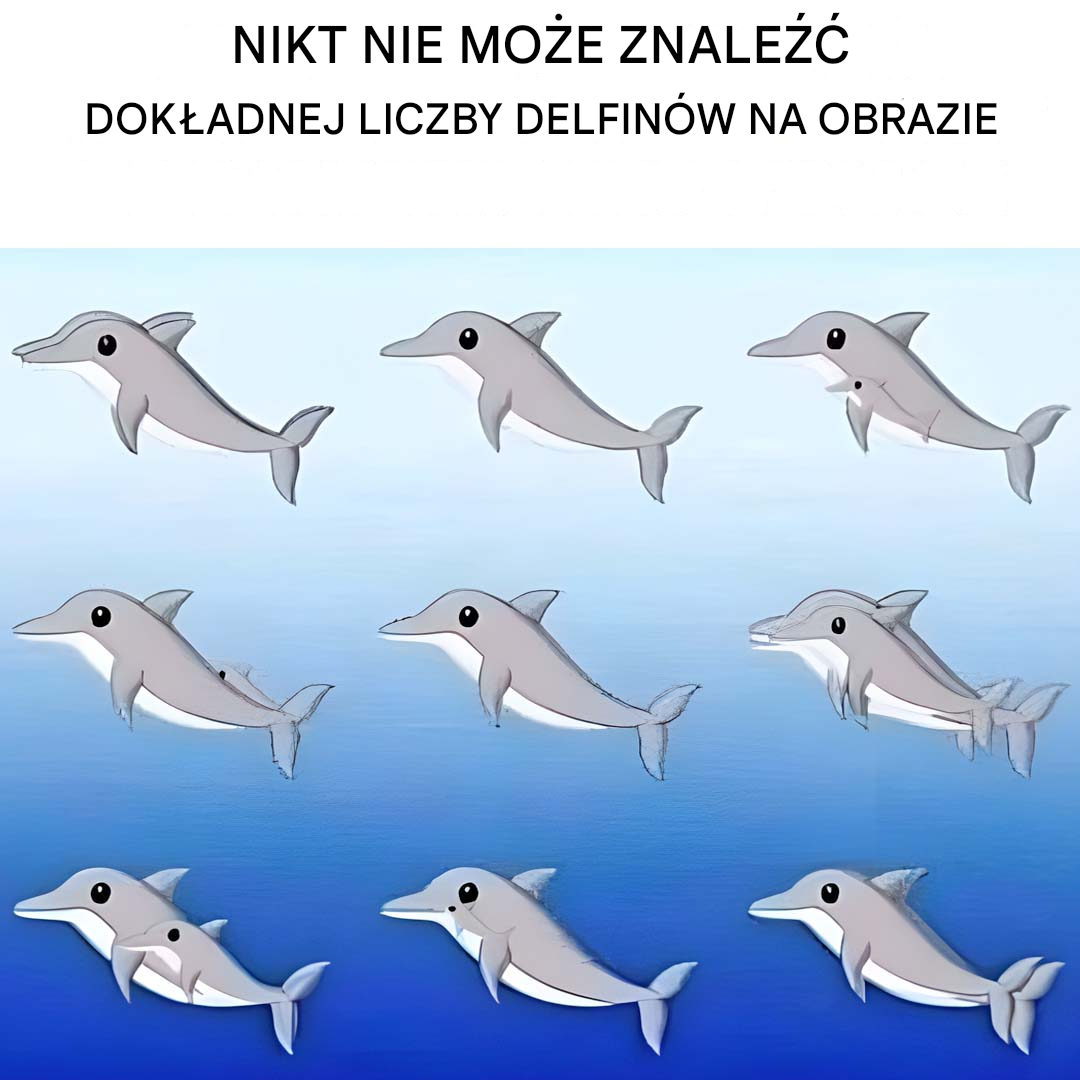 Zdjęcie pełne delfinów bawiących się w morzu… albo prawie. Ile potrafisz dostrzec? Na pierwszy rzut oka wszystko wydaje się oczywiste, ale po bliższym przyjrzeniu się można dostrzec 17 delfinów, z których niektóre są sprytnie zakamuflowane w sylwetkach innych.