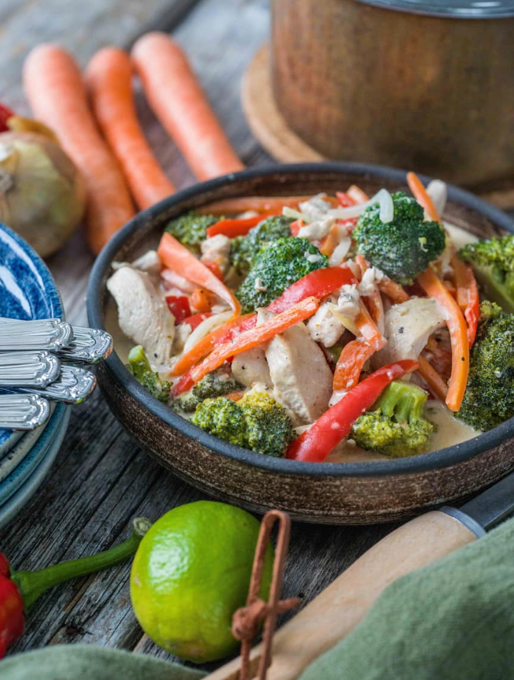 Prosty gulasz z kurczaka z zielonym curry i dużą ilością warzyw, robimy to często i różni się w zależności od warzyw, czasem zastępuję zielone curry czerwonym. Aby było świeże, dodaję trochę limonki.
