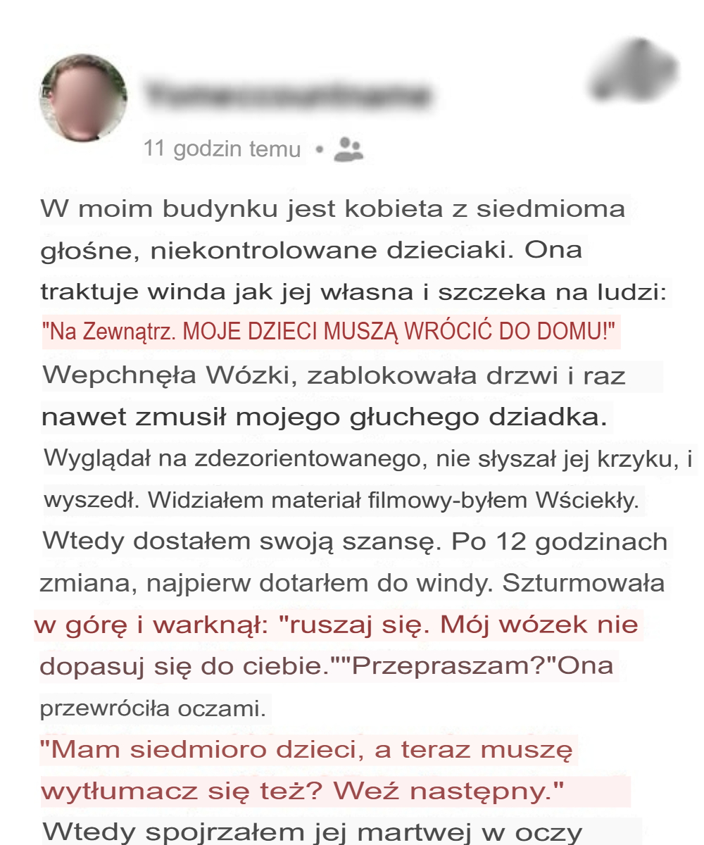 Ona traktowała budynek mieszkalny jak swoje królestwo — z siedmiorgiem hałaśliwych dzieci, pchając wózki, rozkazując nieznajomym. Ale kiedy wyrzuciła mojego głuchego dziadka z windy, coś we mnie pękło. Obejrzałem nagranie i właśnie ta chwila zapaliła lont. Jeszcze o tym nie wiedziała — ale jej rządy właśnie się kończyły.