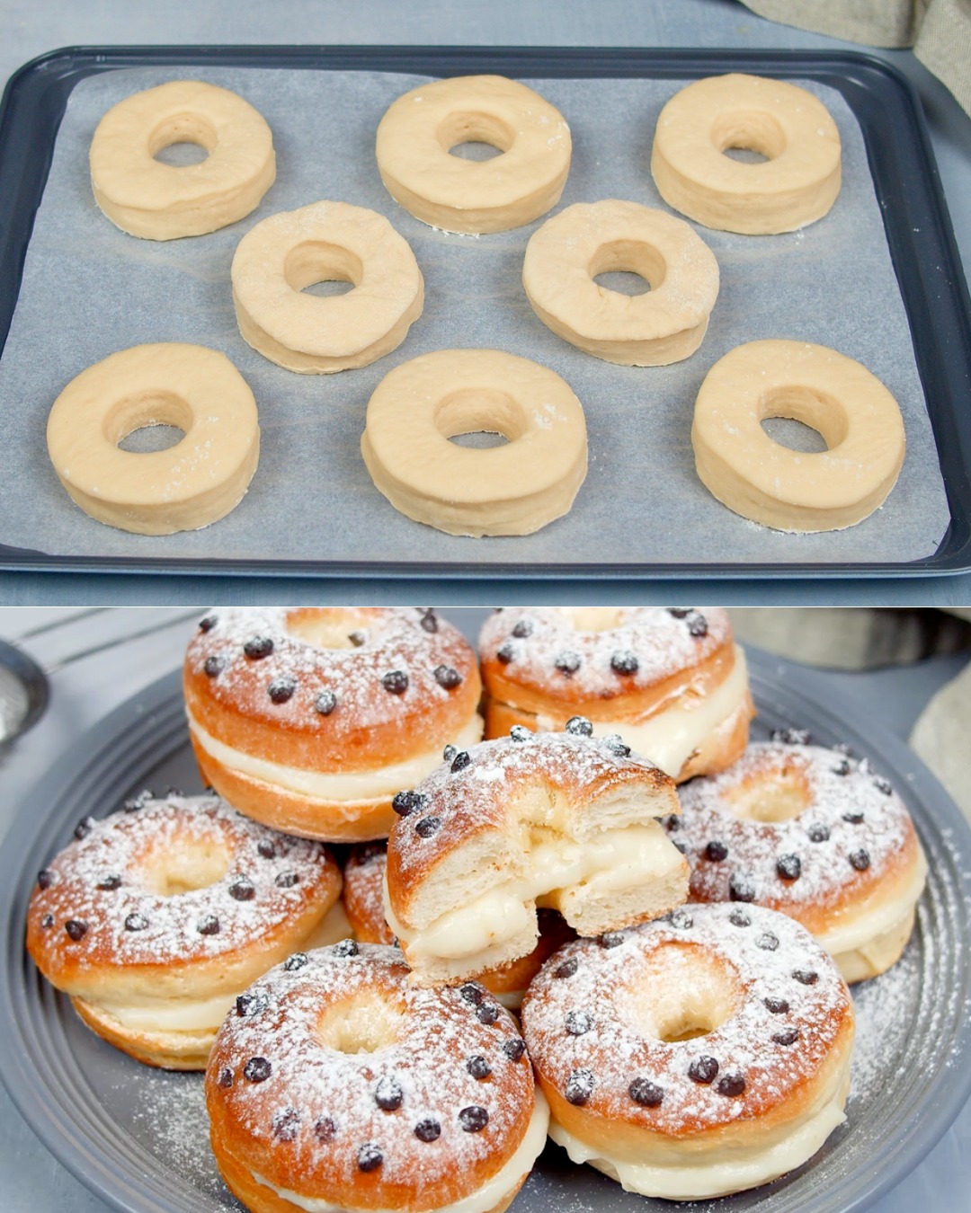 Czy kiedykolwiek marzyłeś o idealnym rozpoczęciu dnia? Te pączki śmietankowe z kawałkami czekolady z pewnością spełnią Twoje oczekiwania! Puszyste, pieczone i wypełnione delikatnym sosem waniliowym, stanowią idealną przekąskę na śniadanie lub na słodką przerwę. Poznaj nasz przepis na te wyjątkowe pączki, które z pewnością zachwycą Twoje podniebienie!