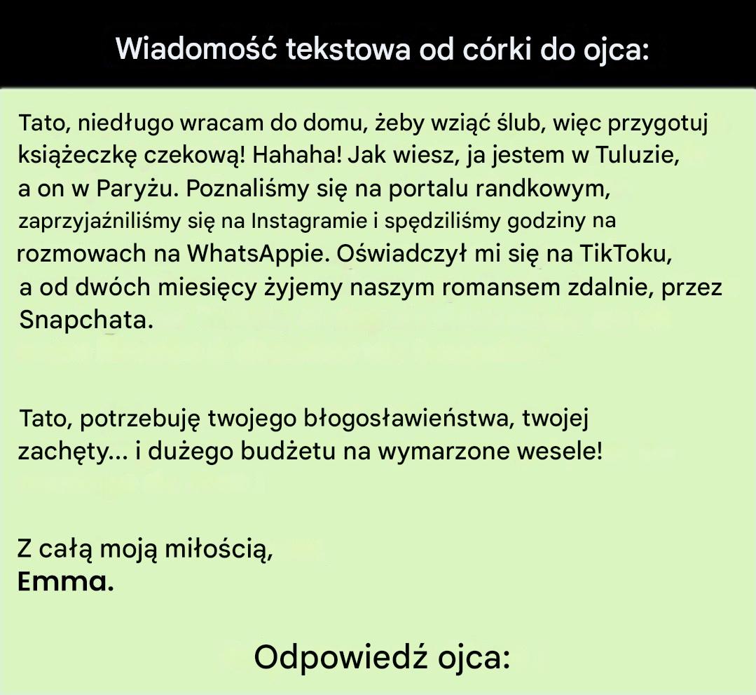 „Tato, niedługo wracam do domu, żeby się pobrać, więc przygotuj książeczkę czekową! Haha!”