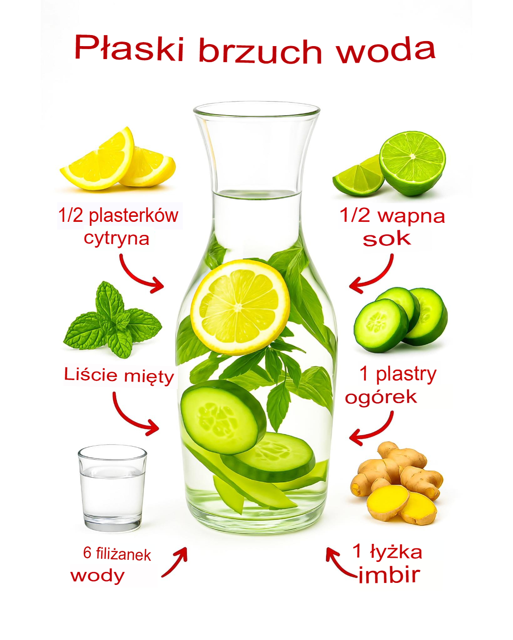 Woda na płaski brzuch to w zasadzie  woda wzbogacona,  którą uzyskuje się poprzez namaczanie owoców, ziół, warzyw i przypraw w wodzie przez kilka godzin. Idea polega na tym, że naturalne składniki uwalniają swój smak i składniki odżywcze do wody, oferując smaczny i zdrowy napój, który wspomaga trawienie, przyspiesza metabolizm i pomaga zmniejszyć wzdęcia.